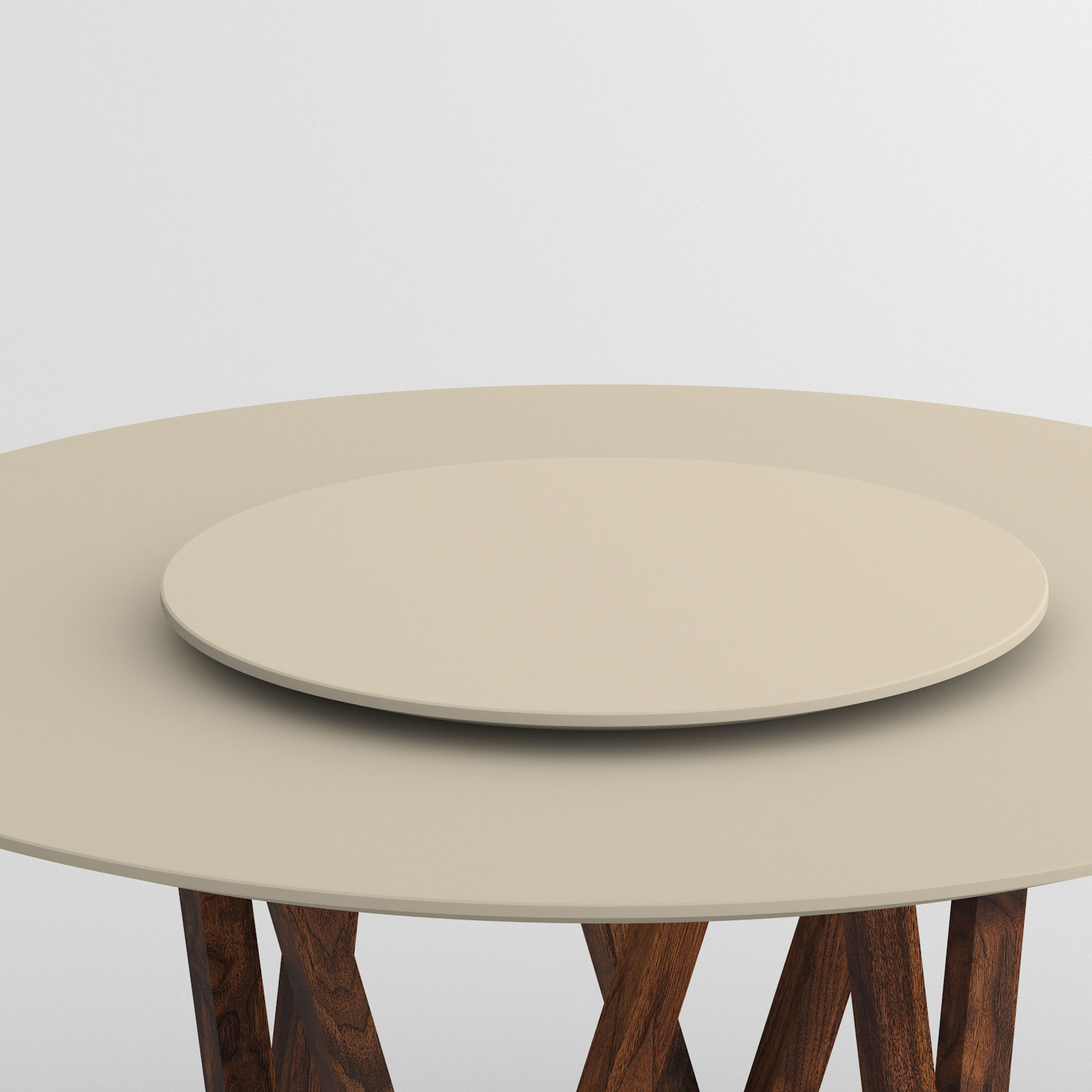 Die runde Form aus Massivholz wirkt mit ihrer warmen Ausstrahlung besonders einladend und ist wie geschaffen für ein lockeres Abendessen in Gesellschaft. Die Mittelsäule mit trapezförmiger Geometrie unterstreicht die visuelle Wahrnehmung und bietet viel Beinfreiheit. Durch die klaren Linien strahlt dieser Tisch Eleganz und Stil aus. Der Drehteller Lazy Susan auf der 160 oder 180 cm großen Massivholztischplatte ist ein dekoratives und funktionelles Objekt.
